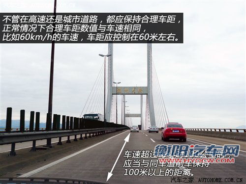 保持车距是个老生常谈的问题,在高速公路上,大家都知道要与前车保持100米以上的车距,同时在《中华人民共和国道路交通安全法实施条例》第八十条中也有所规定。但在城市道路中,大家保持车距的意识就比较弱了。编辑建议大家,在条件允许的情况下,车距应该与自己的车速对应,比较车速为60km/h,合理车距应该为60米。