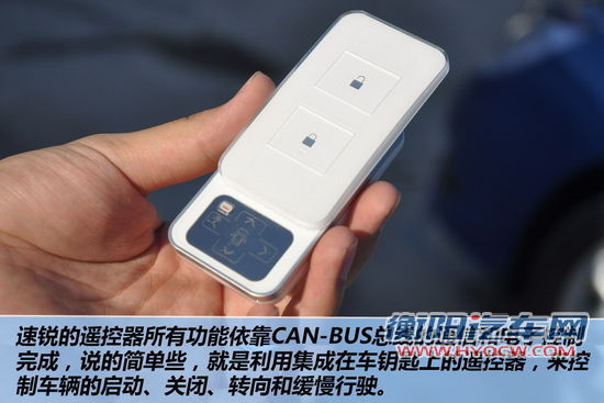 速锐遥控是依靠CAN-BUS总线的通信和电子控制完成,转向则依靠电子助力转向,由电机驱动转向机完成.电子驻车制动也就是电子手刹则负责车辆刹车的解锁和制动。说的简单些,就是利用集成在车钥匙上的遥控器,来控制车辆的启动、关闭、转向和缓慢行驶