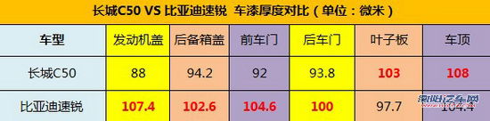 对比点评: 整体来看两车都没有达到及格车漆厚度标准,当然我们理解我,价格决定细节也是难以避免的,相比之下,比亚迪的车漆厚度相对出色一些,厚度都在100附近浮动,车漆分布比较均匀。
