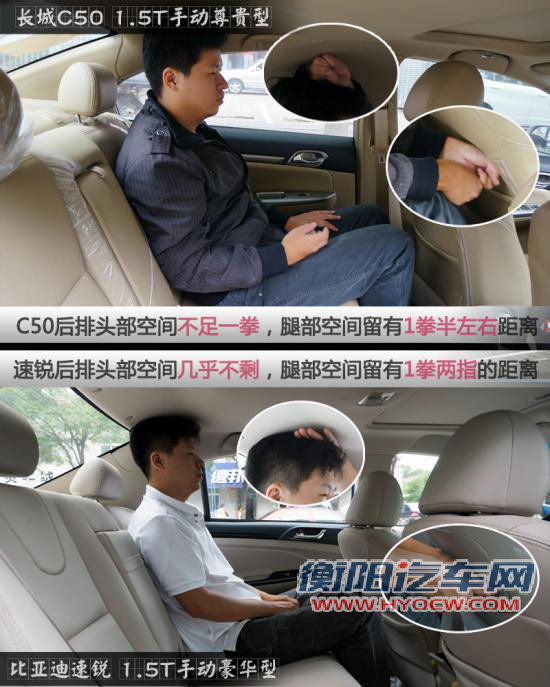 对比点评: 较大的轴距让C50在空间体验方面占有一定优势,特别是后排的头部和腿部空间,完全可以满足超过185公分的人群舒适性,而速锐输在后排头部空间过于紧张,测试人员183cm的身高都只能勉强,头部没有任何的富余。不过两个前排的空间都比较出色,不分上下。