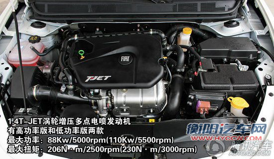 菲翔全系均搭载了这款1.4T-Jet涡轮增压全铝发动机,和菲亚特博悦身上所用的那台相同。根据定位的不同有高功率版和低功率版两种调教,高功率版最大功率110Kw/5500rpm,最大扭矩230N m/3000rpm,而低功率版最大功率88Kw/5000rpm,最大扭矩206N m/2500rpm。6速干式DCT变速箱和5速MT为菲翔的传动系统。其6速双离合变速箱由菲亚特、马涅利-马瑞利以及博格-华纳联合研发,相比于那台并不是很稳定的大众7速DSG,它的体积更小,承受扭力更高(达到350N m)。