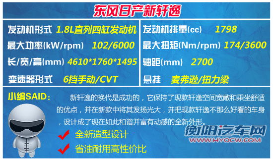 车型简介: 新轩逸在外观上的改变很明显,前进气格栅更换为全新的家族式“X”型前脸,相比现款轩逸的U型前脸显得更有活力,和发动机罩上的隆起部分结合自然,让前脸更具整体感。大灯加入了透镜灯组,造型相比现款轩逸显得更加凌厉,我注意到灯组内有6颗LED灯泡,本以为是日间行车灯,但当开启时发现只是示宽灯而已。新轩逸的头灯和尾灯都采用了回旋造型,前后呼应,波浪形的腰线将它们相连接,让整车看起来更加动感。和现款车型圆润的尾部相比,新轩逸的尾部多了一些棱角,显得更动感,尾灯的位置进行了上移,并加入了LED光源,点亮的效果很炫酷,让新轩逸有了独特的辨识身份。而保险部底部增加了护板,提高了车辆底部的防擦性能。