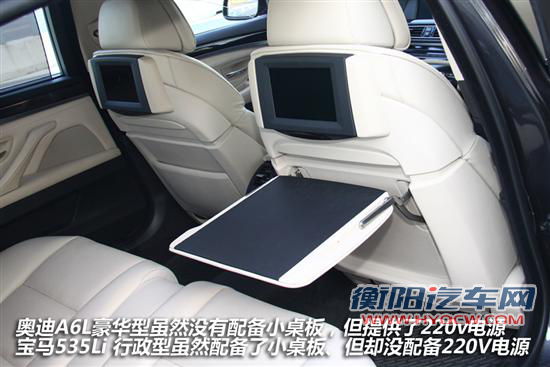 与新奥迪A6L相比,宝马535Li 行政型的配置同样丰富,除了常规的配置外,宝马535Li 行政型还配备了宝马自行研发的泊车辅助系统、偏航辅助系统、以及夜视系统,后排VIP座椅上的乘客可以在这上边进行简单的办公。