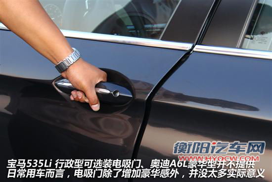 另外,值得一提的是,奥迪A6L 50 TFSI豪华型与宝马535Li 行政型,在安全配置上完全相同,而且高科技配置也是不分上下,但在一些细节配置上却有着明显的差别,比如:新奥迪A6L配备了后排按摩座椅,客气悬挂;而宝马535Li 行政型虽然没有配备,但却配备了电吸门、后排娱乐系统、以及小桌板。从实际乘坐来看,奥迪A6L 50 TFSI 豪华型后排乘坐更为惬意,而宝马535Li 行政型在简单办公方面更有优势。