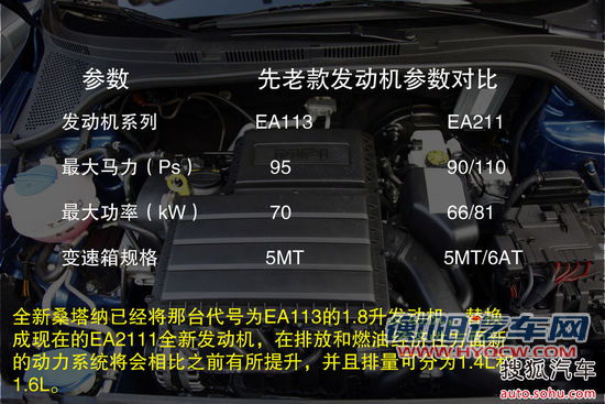 新桑塔纳匹配最新的EA211系列1.4L以及1.6L发动机,EA211发动机是大众蓝驱技术的一部分,采用了MPI发动机技术和铝缸体、模块化缸盖罩壳等外壳技术,重量比目前的EA111发动机还要轻14千克。1.6L 最大功率81kw(110PS) 1.4L机型,最大功率66kw(90PS)。