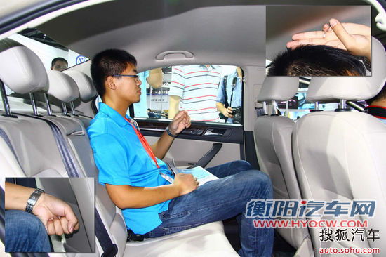 先进入新桑塔纳前排,头顶到车顶能有一拳的距离,进入后排,头部空间缩水到3指,难得的是腿部还能有一拳的活动空间。