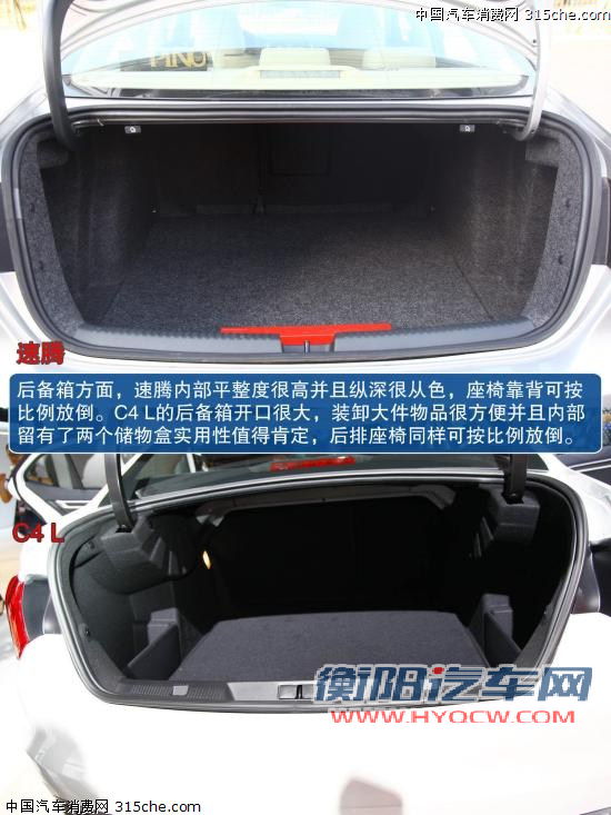 后备箱方面,速腾内部平整度很高,并且纵深很出色,后排座椅靠背可按比例放倒,储物能力大大增加。C4 L的后备箱开口很大,装卸大件物品很方便,并且内部留有了两个储物盒,实用性值得肯定,后排座椅同样可按比例放倒,装载能力同样不错。