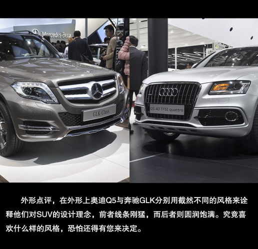 上海车展的大幕已经正式开启,各大媒体已经将焦点聚集盛大的展会。而相对于那些夺目的豪型,我们普通消费者关注的重点恐怕还是在那些力所能及的新车中选择对比。在所有的车型中,SUV则是大家关注度很高车型,而此次推出的新款奥迪Q5就是一款十分热门的车型。而作为宿命中的对手,一汽奥迪新Q5与北京奔驰新GLK的紧凑型豪华SUV车型之争,想必还要更加激烈下去。下面就让我们在车展现场,对这两款热门SUV进行一次全方位的对比吧。