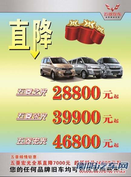 衡阳汽车网讯:近日,从衡阳国菱五菱汽车4S店了解到,五菱全系车型冰点价格直降到底。五菱之光2.88万元起售;五菱荣光39900万元起售;五菱宏光全系直降7000元现金,超低特价46800元起;购其他车型均有优惠。欢迎广大车友前到店赏车、购车!?xml:namespace>