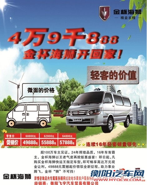 促销价: 金杯海狮快运王 标准型(国Ⅳ) 49888元 ,金杯海狮快运王 舒适型(国Ⅳ) 55888元, 金杯海狮快运王 豪华型(国Ⅳ) 57888元 。