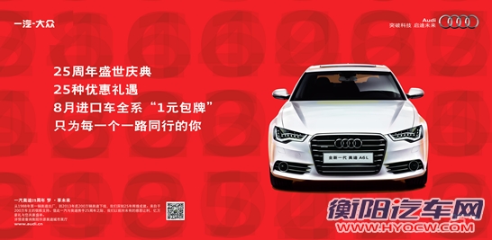 衡阳汽车网讯:从1988年第一辆奥迪出厂,到2013年底200万辆奥迪下线,我们深知25年辉煌成就。来自于200万车主的信赖支持。值此一汽与奥迪携手25周年之际,衡阳华源奥迪城市展厅以前所未有的感恩让利,亿万豪礼与您共襄盛举!