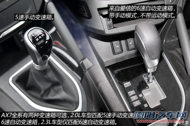 AX7的发动机是从东风雪铁龙C5上面直接“拿”过来的,技术成熟可靠,功率参数处于同级正常水平,扭矩参数较大,和同级别发动机相比有优势。变速箱的匹配上,2.0L车型拥有自动挡和手动挡可选,2.3L则只匹配自动变速箱。
