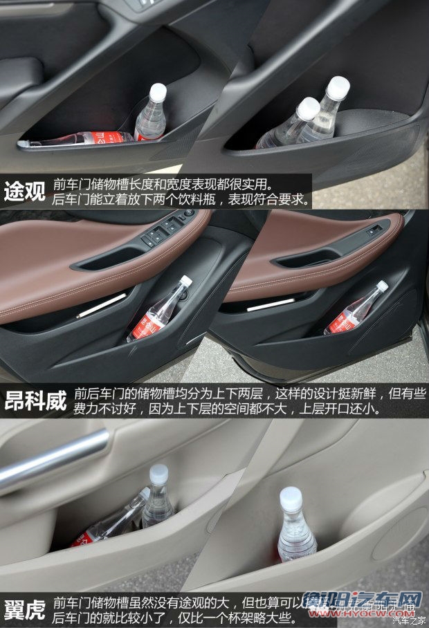 车门板储物槽的表现依然是途观最出色。昂科威虽然精心设计的一番,但效果不太理想。翼虎的后门板上干脆就只提供了一个大杯架,表现垫底。
