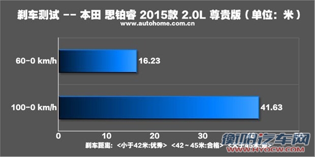 41.63米的制动成绩属于我们认定的优秀水平,但与对手相比没有优势,这与思铂睿选用的轮胎有一定关系。如果选用抓地力更好的轮胎,相信刹车距离仍有缩短的空间。思铂睿的制动踏板行程适中,全力制动时ABS反馈到踏板的力度有些明显,脚上能感觉到较强的振动。