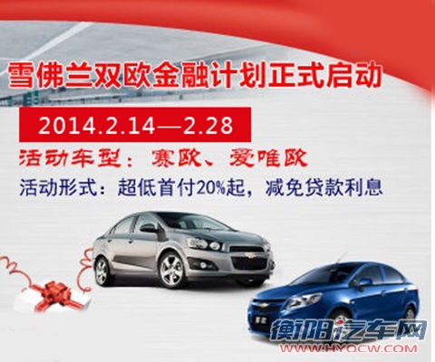 衡阳汽车网讯:马年“双节”去哪儿?衡阳富运雪佛兰与您玩转“双节”。马年“双节”喜相逢,新赛欧与爱唯欧导演并私人定制的“完美约会”将浪漫进行到底!小车大世界,给你稳稳的幸福!双欧“双节”私人定制免息购车专场,新赛欧特供车最高优惠10000元!爱唯欧特供车最高优惠12000元。?xml:namespace>