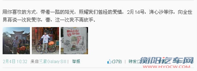 衡阳汽车网讯:没有玫瑰、蛋糕、巧克力,只有2000公里的颠簸骑行,11天路上的披星戴月……近日,网友@Sande_san从丽江骑行到广州示爱的行动得到了大批网友的支持鼓劲,目前其微博疯转达近3万次,甚至被网友亲切昵称为“阳光男”,打响了2014元宵与情人节双合一示爱大行动的第一炮!这个充满了爱与阳光的行为也吸引了东风日产的关注,为传递爱的正能量慨然许下了送车的承诺!?xml:namespace>