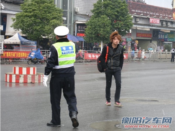 图为民警何方东正在对一名横穿马路的青年进行劝导