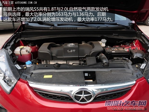 动力方面,瑞风S5共有1.8T及2.0L两款发动机可供选择,其中1.8T发动机最大功率163马力,最大扭矩235N·m,与之匹配的是6速手动变速箱。搭载2.0L自然吸气发动机的车型最大功率136马力,最大扭矩180N·m,与之搭配的则是一台5速手动变速箱。后期江淮还推出了搭载2.0L涡轮增压发动机的车型,最大功率可达177马力。