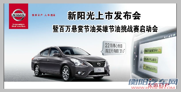 衡阳汽车网讯:2014年3月8日上午10点,东风日产技术派优值家轿新阳光即将在衡阳髙卫4S店上市啦!