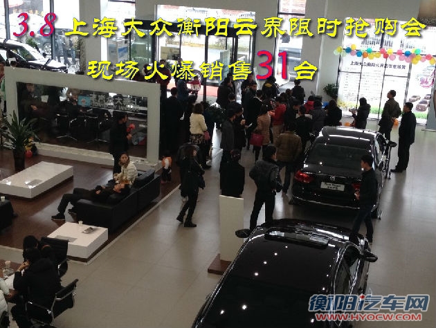 衡阳汽车网讯:2014年3月8日下午:15:00---17:00衡阳云界上海大众4S店举行 ——“三月女人天、 魅力惠无限”限时抢购会活动。活动当天,上百名嘉宾参与了本次活动,现场气氛热烈,活动圆满成功,现场销售31台上海大众汽车。