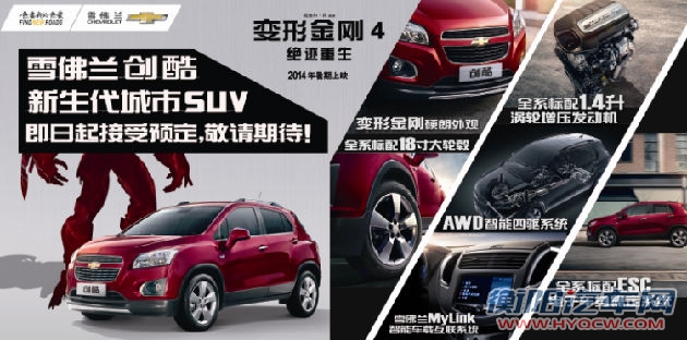 衡阳汽车网讯:今年夏季,备受瞩目的《变形金刚4 • 绝迹重生》即将上映,在这部影片中,新生代变形金刚将有雪佛兰创酷TRAX出演,这也是《变形金刚》中首次出现雪佛兰SUV变形金刚。创酷的丰富配置让你咋舌,预售价13万起,还可能更低。接下来让我们看看创酷的配置。衡阳富运雪佛兰预定热线:0734-8365966