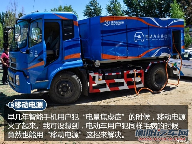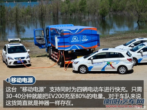 特斯拉的超级充电站的效率确实非常给力,但是它再高效也只是固定地点的充电桩,假若车主驾车到荒郊野地,依然寸步难行。然而北汽新能源给出了一个更加强大的充电方案——把快速充电桩安装到卡车上,而且一装就是四个。这辆名为“电动汽车移动充电站”的卡车,实际上就是一巨号移动电源,当然了,来这儿充电的可不是手机,而是我们的EV200。
