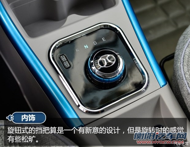 内饰也是在老款车型基础上进行了调整——仪表盘,中控屏幕和换挡旋钮这三处都发生了变化,蓝色装饰条也是EV200内饰的新特征。按下仪表盘右下角的按钮柱,就可以切换中间液晶屏幕显示的内容。