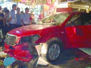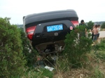 一辆比亚迪F6轿车横在公路上,前左轮胎已经爆裂,车辆严重变形,车辆附近血迹斑斑…