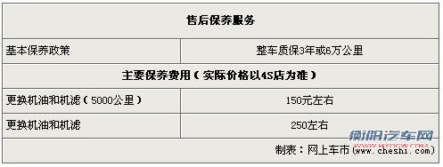 长安志翔整车的质保期为2年货6万公里,首次保养在行驶到5000公里时免费进行,之后每隔5000公里更换一次机油机滤,材料+工时费大约150元左右,大保养根据车况而定,更换三滤的费用在250元左右。
