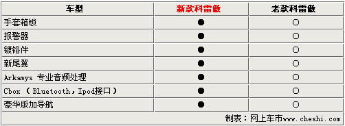 据雷诺4S店销售人员表示,目前2010款科雷傲销售火爆,现车方面比较紧张,只有顶配车型有少量现车。而老款车型也有部分库存,但新老款在价格上均没有出现优惠。现车颜色主要以黑色、白色、灰色、红色为主。部分车型颜色均需要提前订,订货周期要1-2个月的时间,订金1万元。销售人员还表示,全新2010款科雷傲较老款在配置上有明显提升,2010款科雷傲全系车型将增加后尾翼、新款铝合金轮毂、Arkamys专业音频处理、、Bluetooth,Ipod接口,高配车型还添加了导航系统,同时还推出了黑色内饰版,以满足不同消费者的需求。