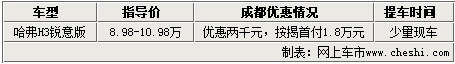 网上车市讯:嘉诚长城4S店消息,为了回馈广大客户一直以来对长城汽车的支持和厚爱,嘉诚汽车针对H3锐意版推出首付1.8万元的按揭优惠,现金优惠依然维持前段时间的两千元幅度: