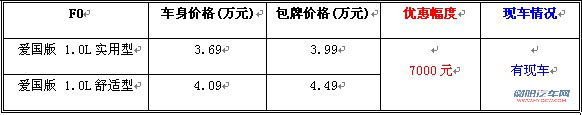 比亚迪F0在深圳市场上,受到了众多消费者的喜爱,特别是年轻的80后消费群体,更是将F0作为第一辆代步小车的首选车型。目前F0全系都有7000元的现金优惠,各款车型均有现车。具体价格信息见下表: