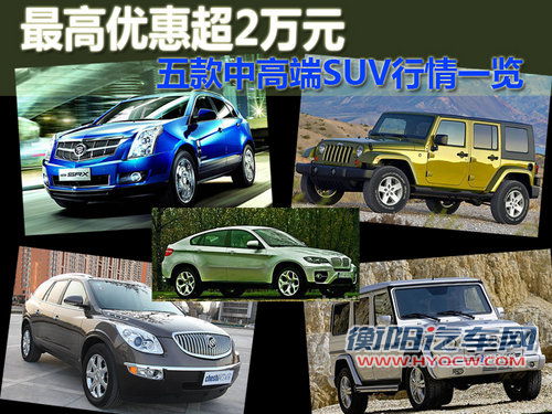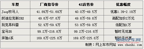 五款车型中,优惠幅度较大的牧马人最高让利超过了2万元,而新SRX和昂克雷车型少,现车数量也较少,提车需加1-2万元。高端车型宝马X6和奔驰G系均没有优惠,订车的话需要1-5个月时间。