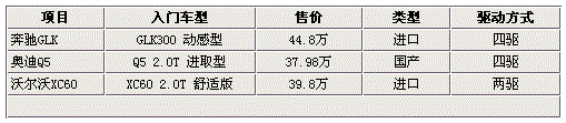 虽然奔驰GLK、奥迪Q5和沃尔沃XC60均属于同级别都市SUV,但由于奔驰GLK为原装进口车型且采用四轮驱动,所以售价明显高于奥迪Q5和沃尔沃XC60。由于北京奔驰GLK采用两驱系统且国产,大大降低了生产成本,所以入门级车型将与售价37.98万的奥迪Q5和售价39.8万的沃尔沃XC60不相上下,预计北京奔驰GLK起售价在39万元左右。