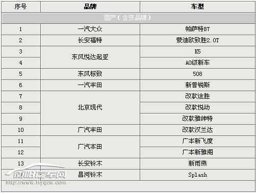 合资品牌在2011年预计将会带来14款新车,其中日韩系车型占据的半壁江山,起亚将带来2010广州车展刚刚上亮的重量级车型K5和一款A0级新车;大众集团将旗下经典车型帕萨特进行垂直换代,推出B7车型;昌河铃木将推出品牌下又一款新车型Splash,与新奥拓正门交锋。