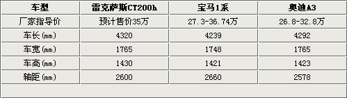 CT200h属于雷克萨斯入门级车型,竞争对手为宝马1系和奥迪A3。 从上表我们可以看出,雷克萨斯CT200h车身尺寸与宝马1系和奥迪A3同属一个级别。在轴距方面CT200h达到了2600mm位于两款车型之间。宝马 1系和奥迪A3的车型都分别搭载了两款不同发动机,所以售价区间跨度比较大,而雷克萨斯CT200h只配备一款有点混合动力引擎,所以售价与1系和A3高配车型持平,预计售价在35万元左右。
