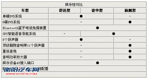 看到现在,三款车型配置各有特色,更加期待的是他是否给力的价格;再往下看:蓝牙免提设备与娱乐设备AV介入端口在当今数字科技娱乐的时代为三车标配也属于必然;三车都配备了DVD系统,仔细对比来看,豪华型和旗舰型DVD还集成了GPS智能语音导航系统,旗舰型的DVD还具有6碟播放功能,减少了驾车时换碟的频繁度,解放了双手;舒适性和豪华型配备了8声道扬声器,而旗舰型的重低音炮、音箱功率放大器和顶级剧院式11扬声器影音娱乐组合对于音乐发烧友来讲绝对的福音~