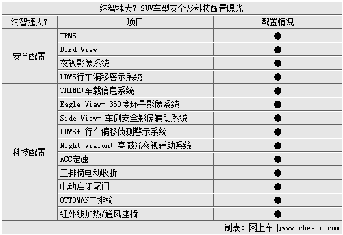 纳智捷大7SUV配置很丰富亮点很多,配备了10.2英寸屏幕,DVD影音系统、真皮座椅、电动天窗、驾驶位电动8向调节、2组记忆座 椅、自动空调、全系配备双安全气囊等高级配置。其实相对于那些超豪华的配置来说,纳智捷SUV最与众不同的还是与HTC(宏达电)联合研发的THINK+ 车载智能系统。该系统内建影音娱乐、电话通讯、卫星导航、行车安全、车主专属、系统设定6大功能。