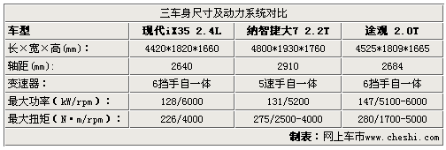 从上表来看,纳智捷大7 SUV 的4800*1930*1760mm车身及2910mm轴距在三车中非常的抢眼,空间方面完全占据上风;三款车型中现代IX35和途观都采用了更为先进的 6速手自一体变速器,而纳智捷采用的是爱信的5速手自一体变速器;在升功率和升扭矩方面,纳智捷表现一般,略胜于现代的IX35,但与大众的2.0T车型 相比,还是有一定的差距。在原有优点的同时,我们能够想象,市场的定价是决定其取得胜算的最重量级的筹码~