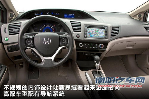 全新一代思域的内饰一改居中仪表盘的设计,采用常规设计方式。从下图中我们可以看出新思域的方向盘、排档杆均采用了全新设计,完全体现出了思域动感和时尚。中控台设计线条感十足,高配车型将配备GPS导航系统。