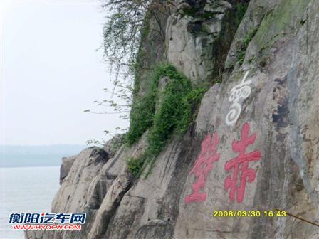 赤壁摩崖石刻 介绍:在赤壁山临江悬岩上,有石刻“赤壁”二字,各长150厘米、宽104厘米,据说当时赤壁大战,孙刘联军火烧曹军战船,江面一片火海,把江边崖壁映得通红,周瑜大败曹军后,把酒庆功,酒酣之余,提剑在崖壁上刻下“赤壁”二字,因是巨手神笔,力盖千钧,字迹竟透过石崖到了山後,映出了反体的“赤壁”二字。二字之上有唐代道人吕洞宾刻“鸾”字形符号。两侧刻有游人诗赋,其下有明初王奉《过赤壁偶成绝句》二 首,诗曰:“赤壁横岸瞰大江,周瑜于此破曹郎。天公已定三分势,可叹奸雄不自量。孟德雄心实啖吴,皇天未肯遂其图。水军八十万东下,赤壁山前一火无。”明正统《嘉鱼县志》载: “赤壁……削壁面西,上有‘赤壁’二字见存”。唐代诗人李白在游览赤壁时写出下了“二龙争战决雌雄,赤壁楼船扫地空。烈火张天照云海,周瑜于此破曹公。”的著名诗句。