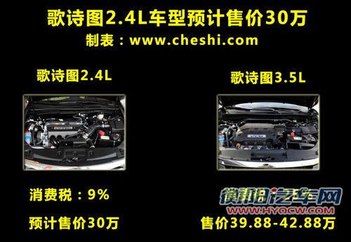 目前广汽本田歌诗图在国内销售的车型只有两款,排量均为3.5L,厂商指导价为39.88-42.88万元。2.4L车型的推出不仅可以丰富消费者的选择 空间,而且在价格上也更加具有优势。通过上表我们可以看到,3.5L歌诗图在乘用车消费税方面均要缴纳25%的大排量消费税。而在2.4L车型的税率则降 至9%,减少14%可以进一步降低歌诗图的入门级门槛,考虑到其他竞争对手的售价,我们预计歌诗图2.4L车型的售价将在30万元左右。