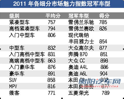 近日,J.D. Power亚太公司发布了2011年中国汽车性能、运行和设计研究报告(APEAL),即汽车魅力指数榜。在入门高档中型车细分市场评选中,奔腾B70以远高行业平均值,851分的成绩荣膺该细分市场冠军。值得一提的是,一汽奔腾是唯一一个入榜的自主轿车品牌。