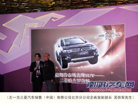 由国内著名越野网站越野e族组织评选的“2012最佳SUV大选”于12月18日晚在北京揭晓,帕杰罗•劲畅获得“最期待市场表现SUV”大奖。