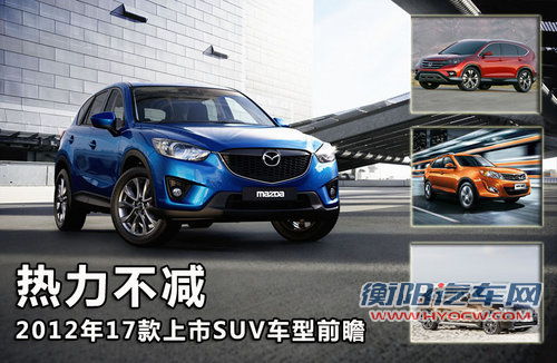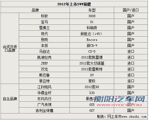 为了迎合国内消费者的偏爱,即便在销量日益下滑的今天,国内外的汽车厂商们还是联手为我们奉献了十余款SUV车型。其中,以国产身份上市的宝马X1、雪佛兰科帕奇以及别克Encore等车将会以更为低廉的价格增加其竞争力,而如马自达CX-5、斯巴鲁路XV和新大切则以其先进的技术或是良好的口碑在上市之前便赚足了眼球,除此之外,多款自主品牌SUV的上市也为2012年的SUV市场增添了浓墨重彩的一笔。