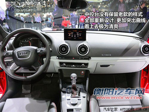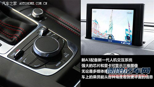 内饰方面,我们看到全新A3的中控台以黑色为主色调,同时辅以银色装饰条来提升整体质感并体现年轻化的风格。配置上,全新A3不可或缺的拥有全新MMI系统,其中包含车辆信息、多媒体功能和GPS导航系统等,同时,这套系统的核心是一块1.2G的双核处理器,搭配高速图形显卡,使奥迪A3成为第一款能在车上显示三维图像的车型,届时无论是多媒体播放还是导航,车上的乘员能从各种角度看到丰富得多的信息。
