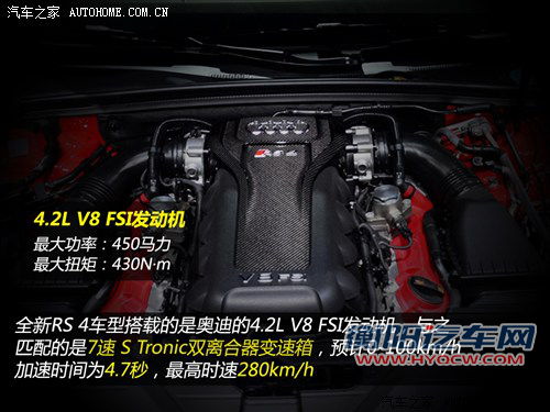 动力方面,奥迪RS4搭载了4.2L V8发动机,最大功率450马力,最大扭矩430N·m,传动部分是S tronic自动变速箱,另外,该车还配有quattro全轮驱动系统。在性能数据上,预计RS4 0-100km/h的加速时间为4.7秒,最高时速280km/h。另外,新车配备的quttro全轮四驱系统拥有着非常宽泛的扭矩分配能力,前轮最多可分配到70%的扭矩,后轮最多则可以获得85%的扭矩,以使车辆获得更加完美的动力输出。