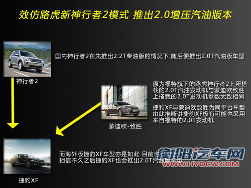 按照目前捷豹路虎的引进套路来推断,以神行者2为例,新神行者2在先推出2.2升柴油版之后再推出2.0T汽油版。而目前欧版的捷豹XF已经推出了2.2柴油版,捷豹XF极有可能效仿神行者2也推出一款2.0T汽油版。