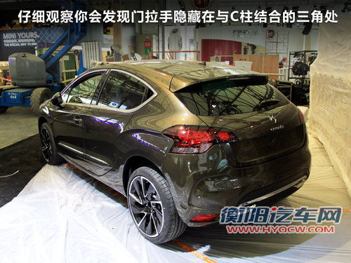 DS4虽然采用五门掀背设计,仔细观察的话你会发现门拉手隐藏在与C柱结合的三角处,黑色的外观极难被发现。超炫的轮毂也是DS4一大亮点,采用双色合金轮圈设计,顶配车型轮毂尺寸将达到19寸。雪铁龙提供的340毫米通风盘式制动器会作为全系标配。