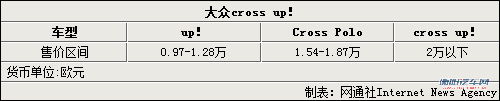 对于大众这款即将推出的Up!跨界车的推出时间暂时未透露,但是据相关信息,这款大众Up!跨界车的售价不到20000欧元(折合人民币约为164,244元)。但根据先前up!上市的售价来看,cross up!售价很有可能并没有预测的那么高。